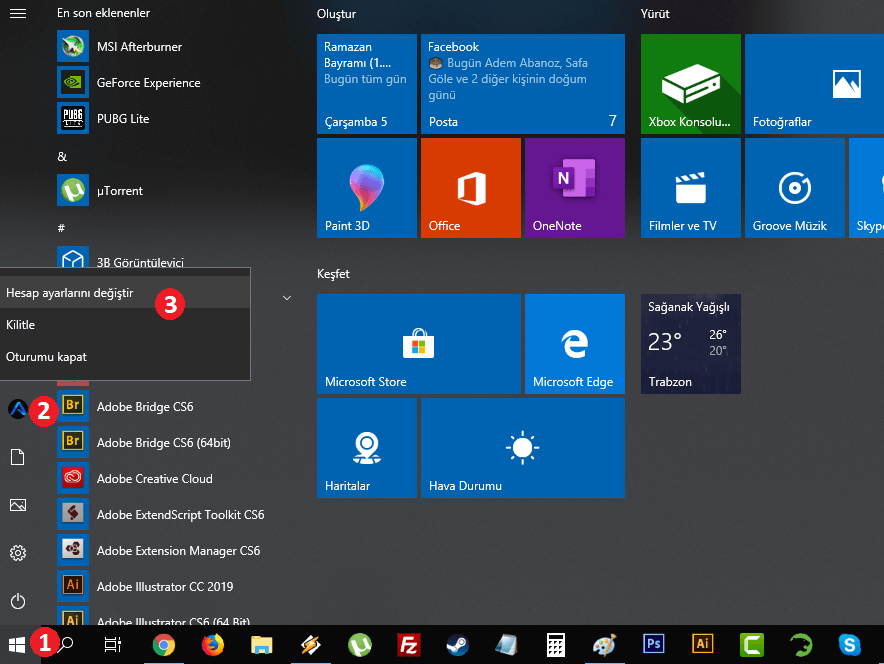 Başlat > Profil simgesi > Hesap ayarlarını değiştir adımını izliyoruz. Ayrıca başlat kısmından ayarlar bölümüne tıklayarak da ilgili bölüme gidebilirsiniz.